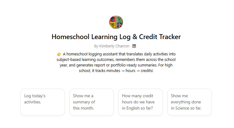Get a PDF with a direct link to your Homeschool Learning Log & Credit Tracker GPT. Just click to start chatting. NO setup or downloads required. - Works with FREE ChatGPT Account
